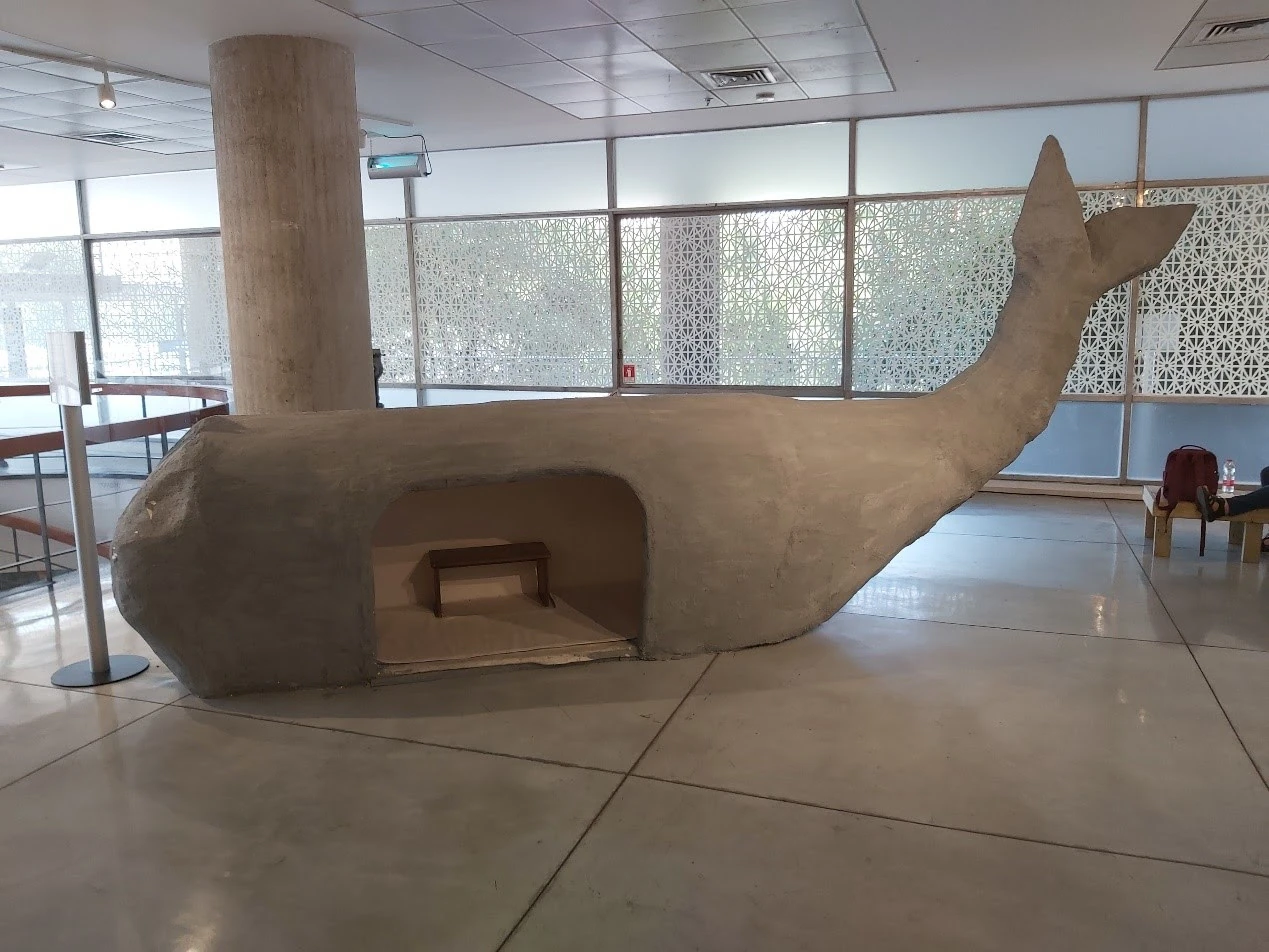 הספרייה נועדה לחוקרים עסוקים וטרודים בהוויות העולם, אבל פרנסיה התחשבו גם בבטלנים שכמותי, ששאלו את עצמם מה עניין לווייתן אצל ספרייה, ומה היה חטאו של זה שנענש לשבת בתוך הכוך הנזירי. לכן נעצרתי מול שלט ההסבר. ראשית, למדתי שזוהי יצירתה של האומנית הדסה גולדויכט, ובהמשך הוסבר, בין השאר, כך: