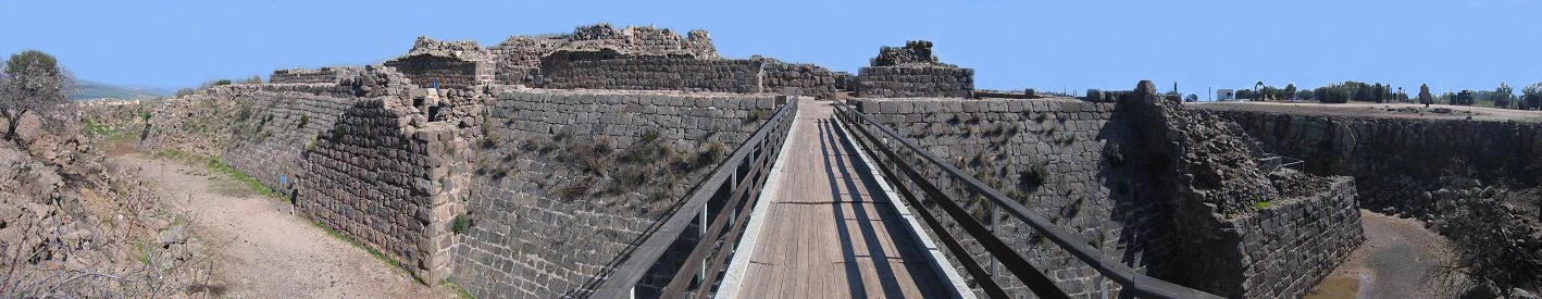 תמונה פנורמית (180°) של החפיר והחומה המערבית. משני צידי הגשר ובין המגדלים ניתן להבחין בחומה המשופעת - ה"חלקלקה".