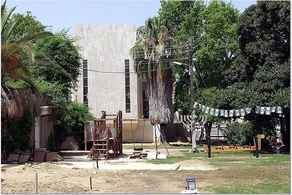 הצד האחורי של בית הכנסת ביישוב ובו גן ציבורי
