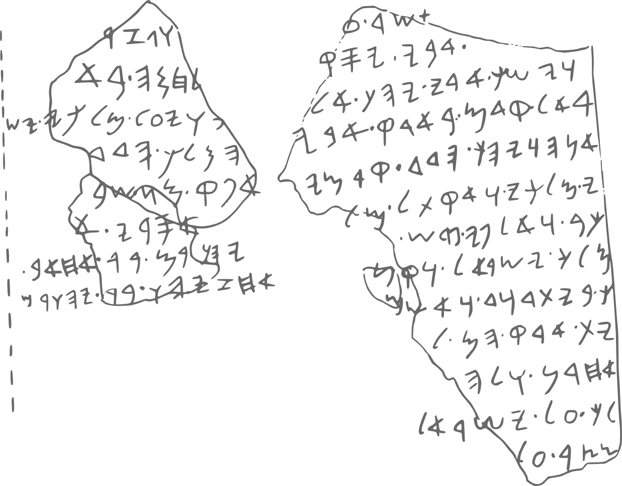 1.[ א]מר.ע[ ]וגזר[ ] 2.[]אבי.יסק[.עלוה.בה]תלחמה.בא--- ] 3.וישכב.אבי.יהך.אל[.אבהו]ה.ויעל.מלכי[ש] 4.ראל.קדם.בארק.אבי[.ו]יהלך.הדד[.]א[יתי] 5.אנה.ויהך.הדד.קדמי[.ו]אפק.מן.שבע[ת---] 6.י.מלכי.ואקתל.מל[כן.שב]ען.אסרי.א[לפי.ר] 7.כב.ואלפי.פרש.[קתלת.אית.יהו]רם.בר[אחאב.] 8.מלך.ישראל.וקתל[ת.אית.אחז]יהו.בר[יהורם.מל] 9.ך.ביתדוד.ואשם.[אית.קרית.הם.חרבת.ואהפך.א] 10.ית.ארק.הם.ל[ישמן ] 11.אחרן.ולה[... ויהוא.מ] 12.לך.על.יש[ראל... ואשם.] 13.מצר.ע[ל. ]