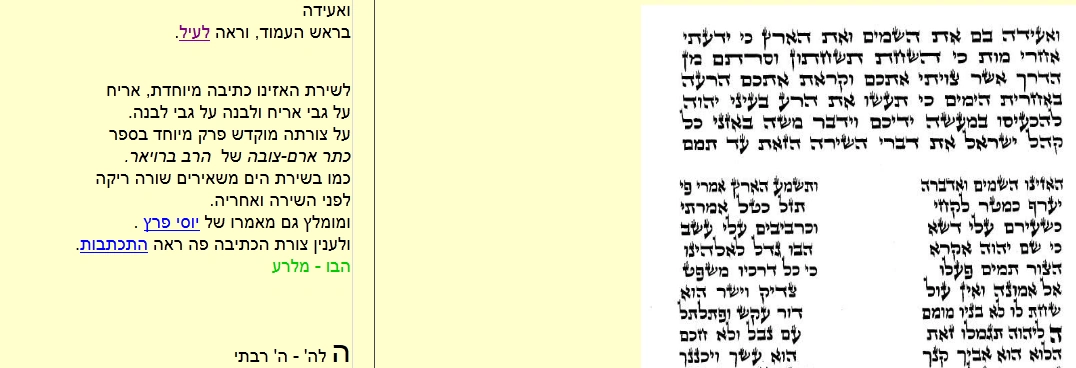 | וַיָּבֹא מֹשֶׁה, וַיְדַבֵּר אֶת-כָּל-דִּבְרֵי הַשִּׁירָה-הַזֹּאת בְּאָזְנֵי הָעָם: הוּא, וְהוֹשֵׁעַ בִּן-נוּן. וַיְכַל מֹשֶׁה, לְדַבֵּר אֶת כָּל הַדְּבָרִים הָאֵלֶּה אֶל כָּל יִשְׂרָאֵל. וַיֹּאמֶר אֲלֵהֶם, שִׂימוּ לְבַבְכֶם, לְכָל-הַדְּבָרִים, אֲשֶׁר אָנֹכִי מֵעִיד בָּכֶם הַיּוֹם: אֲשֶׁר תְּצַוֻּם, אֶת-בְּנֵיכֶם, לִשְׁמֹר לַעֲשׂוֹת, אֶת-כָּל-דִּבְרֵי הַתּוֹרָה הַזֹּאת. כִּי לֹא-דָבָר רֵק הוּא, מִכֶּם כִּי הוּא, חַיֵּיכֶם; וּבַדָּבָר הַזֶּה, תַּאֲרִיכוּ יָמִים עַל-הָאֲדָמָה, אֲשֶׁר אַתֶּם עֹבְרִים אֶת-הַיַּרְדֵּן שָׁמָּה, לְרִשְׁתָּהּ (ספר דברים, ל"ב, מ"ד-מ"ז | ||