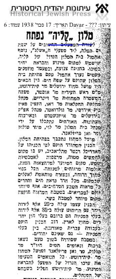 פתיחת המלון - ידיעה מיום 17 בפברואר 1938 באתר דבר יש עוד 28 ידיעות על המלון