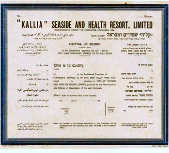 תעודת מנייה של חברת קליה: שפת ים ומבראה בע"מ. מקור התמונה באתר ברלב ושות', רואי חשבון,בו קיים מדור מניות המציג תעודות יודאיקה והישוב היהודי. בבורסה לניירות ערך בתל-אביב, קיימת תערוכת סקריפופיליה (תעודות היסטוריות של ניירות ערך) המקיפה את ההיסטוריה הכלכלית של היישוב היהודי בארץ-ישראל. אתר ברלב ושות'